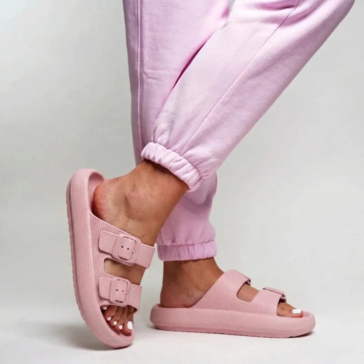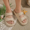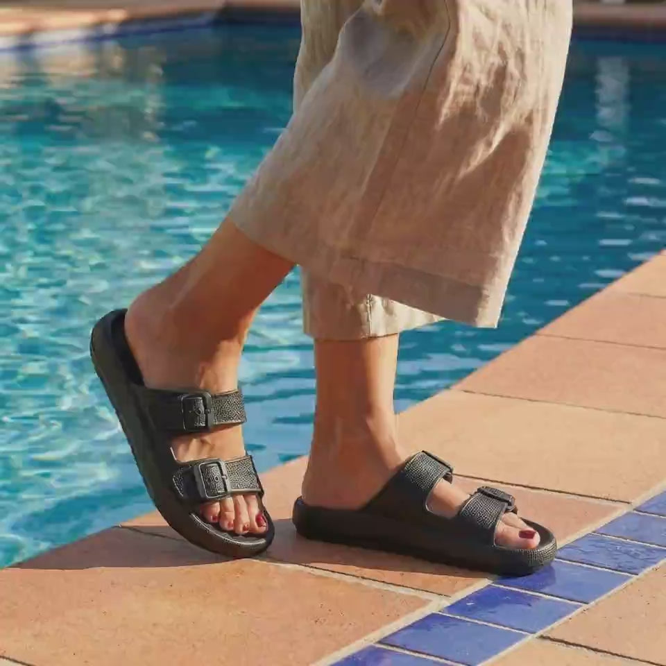 Premium Material: Upper: Textured lightweight EVA upper with adjustable buckles Footbed: Soft molded cushioned base Sole: Lightweight flexible EVA platform Outsole: Anti-slip textured grip