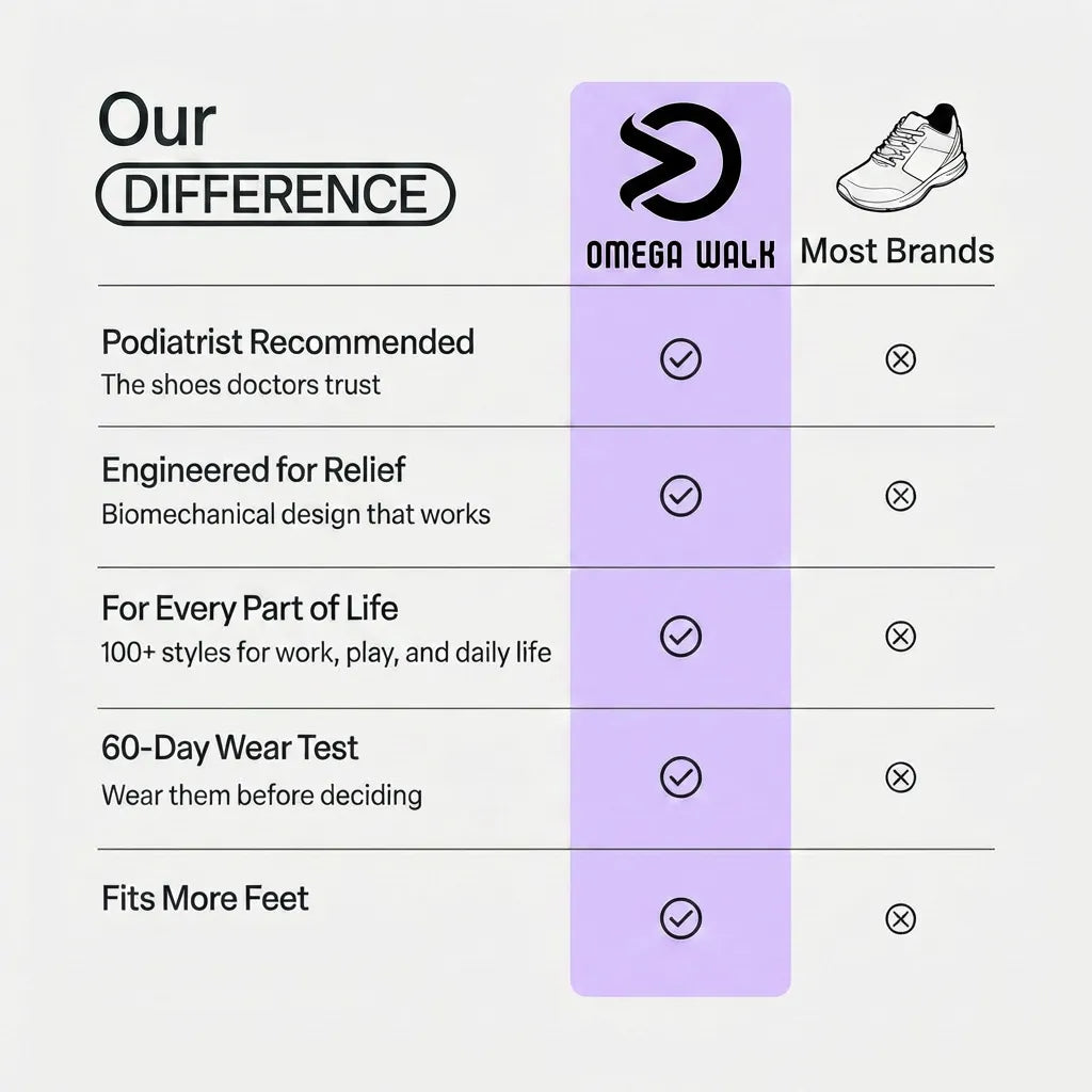 At Omega Walk, we understand how painful plantar fasciitis can make every step. Our shoes are built to bring relief — with targeted arch support to reduce strain, plush heel cushioning to ease pressure, and an ergonomic sole that promotes natural movement. Every detail works together to absorb impact, protect sensitive heels, and help you walk pain-free again.